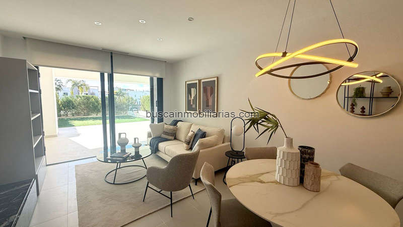 Cuenta con un luminoso salón-comedor con acceso directo a la terraza y jardín privado, creando un espacio perfecto para disfrutar del exterior. Dispone de dormitorio principal en suite, un dormitorio de invitados y un baño adicional. La cocina totalmente equipada incluye una zona de lavandería independiente y acceso a un patio trasero privado, aportando practicidad al día a día. Desde el jardín privado se accede directamente a las zonas comunes de la urbanización.