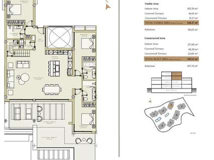 La urbanización consta de siete elegantes edificios de tres plantas cada uno, cuidadosamente situados para aprovechar al máximo las vistas al mar y la luz natural. Los apartamentos están disponibles en configuraciones de 2, 3 y 4 dormitorios, con interiores bellamente elaborados y acabados de alta calidad. Los apartamentos de la planta baja cuentan con amplios jardines privados, mientras que los áticos disponen de solárium y piscina privados. Todos los apartamentos cuentan con modernas cocinas Modulnova, que ofrecen una mezcla de estilo y funcionalidad.
