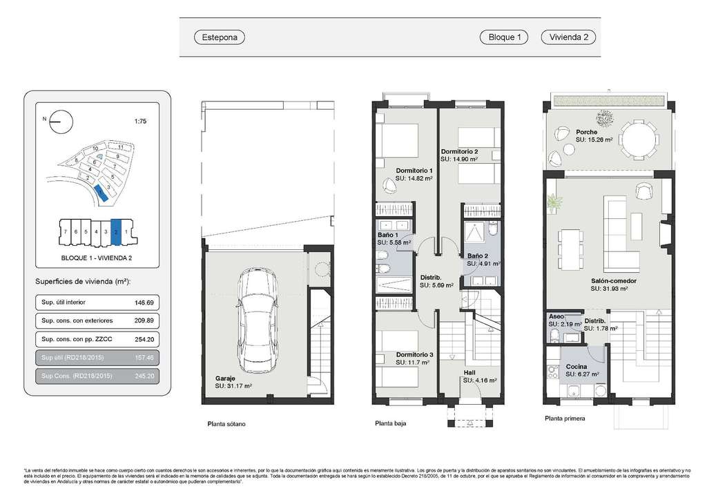 Las propiedades se distribuyen en dos plantas principales más un sótano, y ofrecen tres dormitorios, dos baños y un aseo de invitados. Cada vivienda cuenta con amplias terrazas privadas, y algunas unidades disponen de solárium en la azotea con impresionantes vistas al mar y a los campos de golf circundantes.