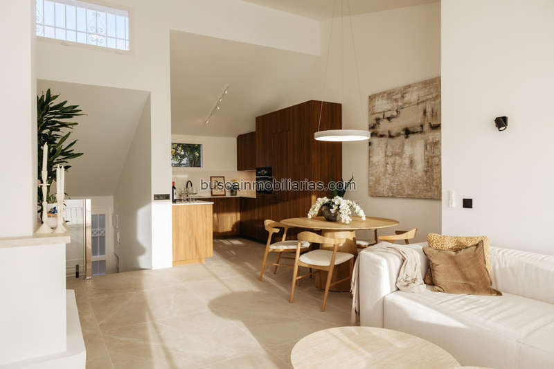 Se accede a un espacio diáfano, luminoso y elegante que integra perfectamente la cocina moderna, el comedor y el salón. Los techos altos aportan una maravillosa sensación de amplitud y luz natural, mientras que la acogedora chimenea añade calidez y carácter, haciendo de este espacio el lugar ideal tanto para la vida diaria como para el entretenimiento.