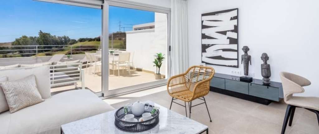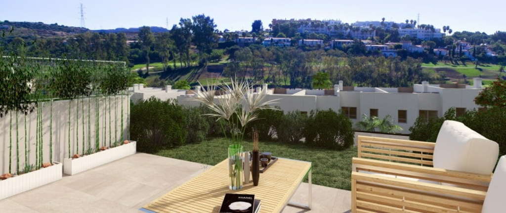 Casa adosada con vistas al campo de golf de Esteponaubicadas en Estepona Oeste en la Costa del Sol. Esta vivienda de 3 dormitorios y 3 cuartos de baños disfruta de mucha luz natural, amplia terraza y están rodeadas de un paisaje espectacular con vistas panorámicas al campo de golf y al mar.