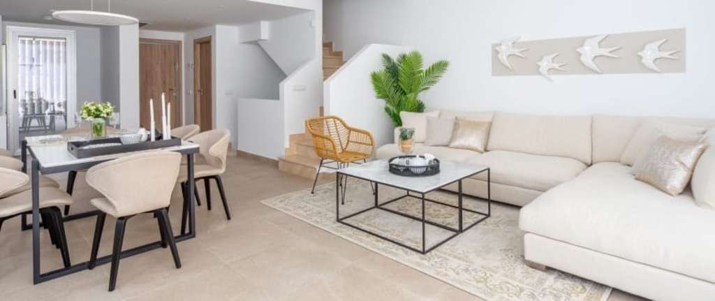 Lista para vivir- Casa adosada de 3 dormitorios a la venta. Esta moderna vivienda es amplia y está inundada de luz natural. Posee una construcción de alta calidad con materiales de lujo combinados con un diseño sofisticado. Construida en 3 niveles se beneficia de 3 dormitorios, 3 baños, sala de estar y cocina integrada, sótanoprivado y trastero. La vivienda disfruta de una gran terraza orientada al sur, con espectaculares vistas panorámicas del campo de golf, la costa y las montañas.