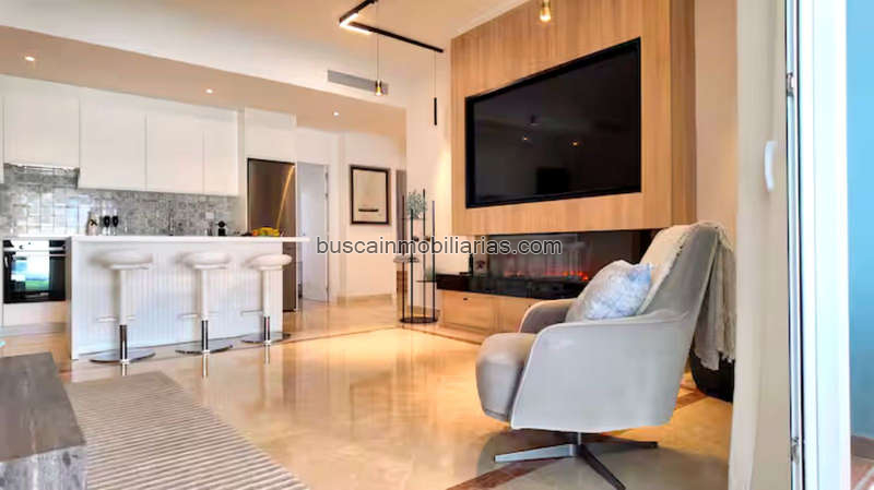 Cocina totalmente equipada integrada con una acogedora zona de estar, creando un ambiente moderno y agradable.