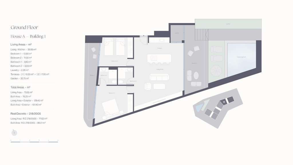 Las viviendas de planta baja disponen de jardín y piscina privada opcional, y los áticos cuentan con solarium y piscina en la azotea.