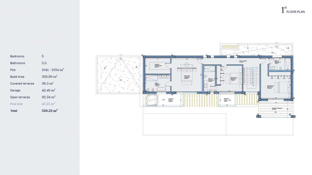 Cada residencia está construida en parcelas de más de 1000 m² y distribuida en dos niveles, con 4 o 5 dormitorios, piscinas privadas y amplias terrazas perfectas para disfrutar del aire libre. Algunas villas incluso cuentan con impresionantes vistas al mar desde la planta superior. La finalización está prevista para principios de 2026, lo que le brinda la oportunidad de hacer realidad su sueño mediterráneo.