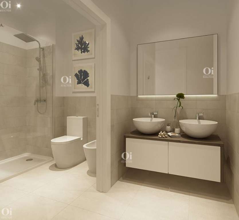 El suelo interior de viviendas, en meseta de entrada, salón, dormitorios y distribuidores en porcelánico a elegir entre opciones propuestas y porcelánico en zonas baños y cocinas. Solados exteriores transitables en piezas cerámicas antideslizante de PORCELANOSA.