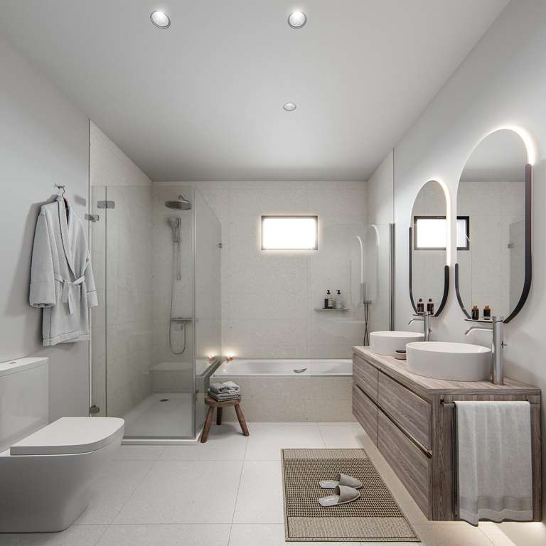 Los interiores de los apartamentos están diseñados con un enfoque en la funcionalidad y la luminosidad. Los salones-comedor, abiertos y ventilados, se llenan de luz natural gracias a los grandes ventanales que conectan con las terrazas, creando una sensación de continuidad entre el interior y el exterior. Los espacios han sido cuidadosamente distribuidos para maximizar el bienestar, con materiales de alta calidad y acabados modernos que reflejan la elegancia y el confort. Los dormitorios, amplios y acogedores, están pensados para ofrecer un refugio de descanso, mientras que los baños y cocinas están equipados con lo último en diseño y tecnología para garantizar una experiencia de vida contemporánea y placentera.
