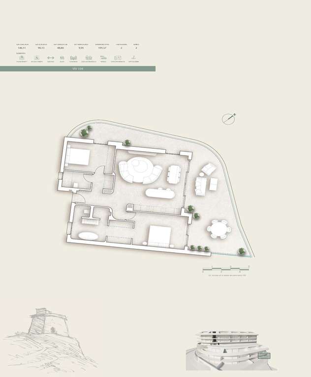 Cada apartamento incluye 2 o 3 plazas de aparcamiento y 1 trastero. Las viviendas están acabadas con materiales de alta gama y especificaciones de lujo, como suelos y azulejos de gran formato, cocinas totalmente equipadas con electrodomésticos Miele, baños con mueble de lavabo, espejo y mamparas de ducha, y aire acondicionado por conductos totalmente instalado.