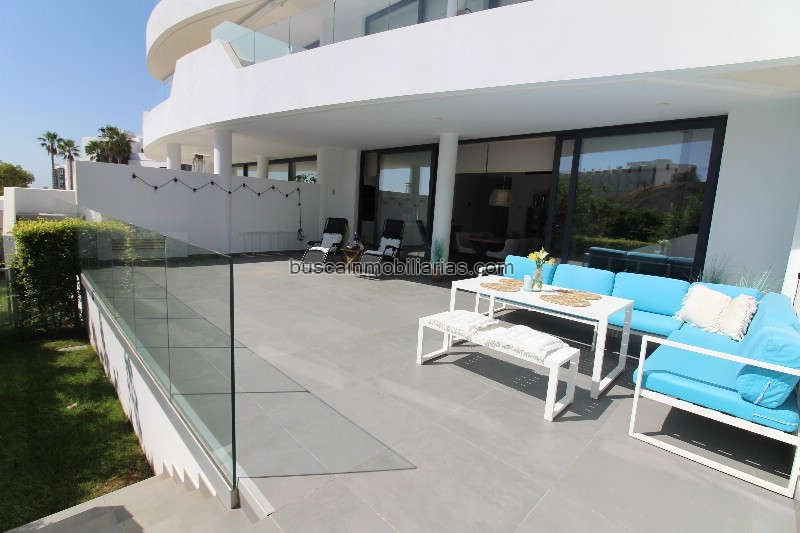 Las terrazas tiene un total de 64m2 de terraza, La terraza donde el salón/cocina está una parte cubierta. También hay un pequeño césped al final de la terraza. Hay un aparcamiento interior y otro exterior que pertenece al apartamento, además hay tambien un trastero de buen tamaño..