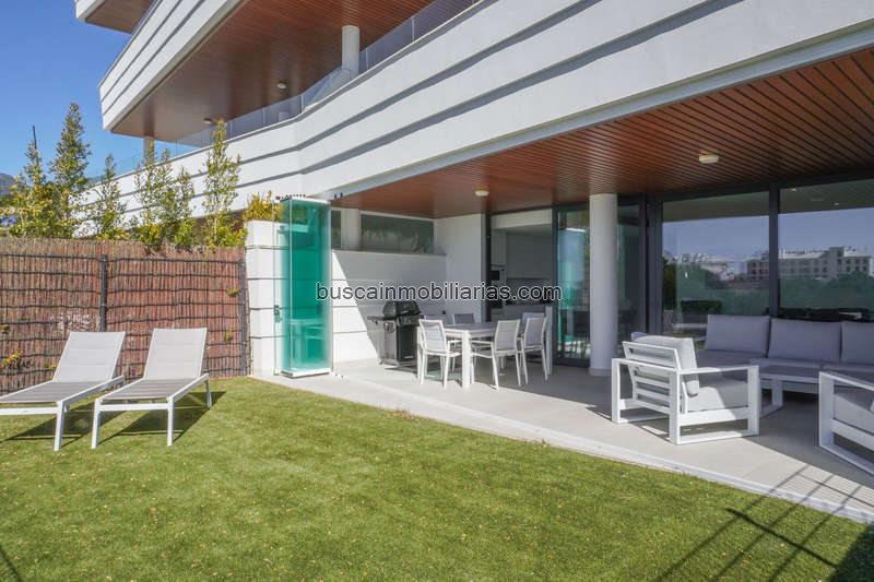 La terraza se puede separar del jardín con elegantes puertas correderas, lo que permite ajustar la privacidad y la amplitud según sea necesario.