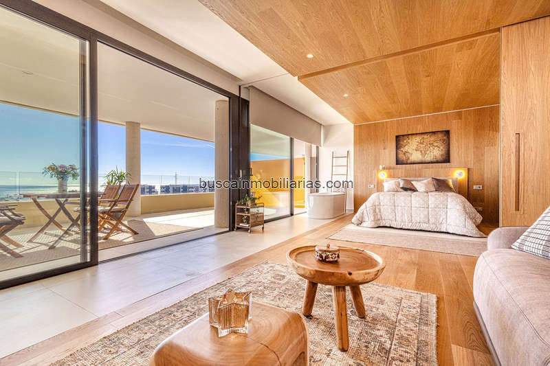 Gracias a su orientación sur, la vivienda disfruta de una luz natural magnífica durante todo el día y de bonitas vistas al mar desde el salón y la terraza. El interior combina un diseño moderno con acabados cálidos y de alta calidad. La distribución es abierta y funcional, con ventanales de suelo a techo que potencian la luminosidad y la sensación de amplitud. El dormitorio principal cuenta con una pared corredera que se abre al salón, aportando un toque de lujo y flexibilidad al espacio.
