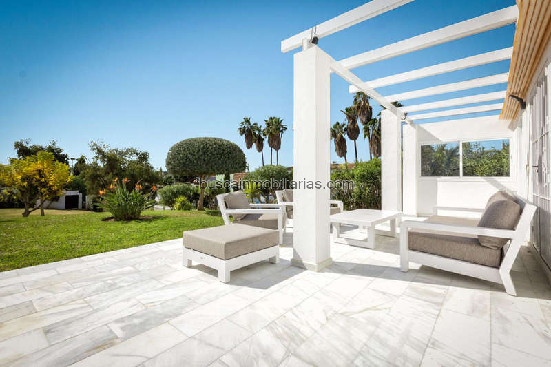 gran terraza ajardinada con vistas a la piscina