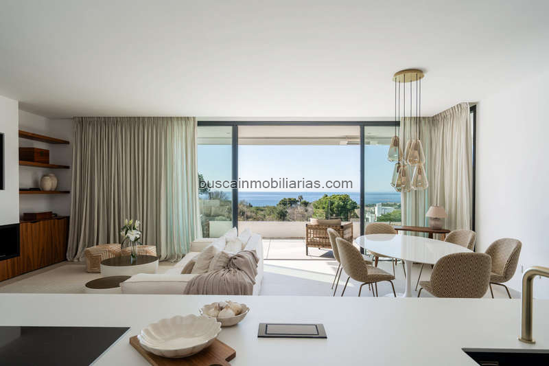 Este refinado apartamento de 3 dormitorios está bañado de luz desde el amanecer hasta el atardecer y regala puestas de sol inolvidables. La zona de estar de concepto abierto cuenta con puertas de cristal de suelo a techo, permitiendo que la luz natural inunde el espacio, enmarcando las panorámicas vistas al mar y a la montaña como si fueran una auténtica obra de arte.