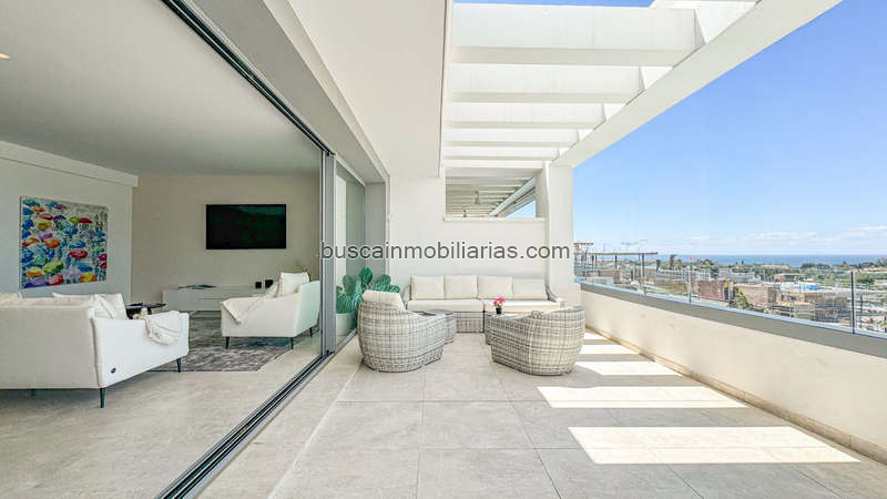 Ático dúplex contemporáneo con terraza y solárium, ambos con vistas panorámicas al mar Mediterráneo y rodeados por los fairways del campo de golf de Santa Clara