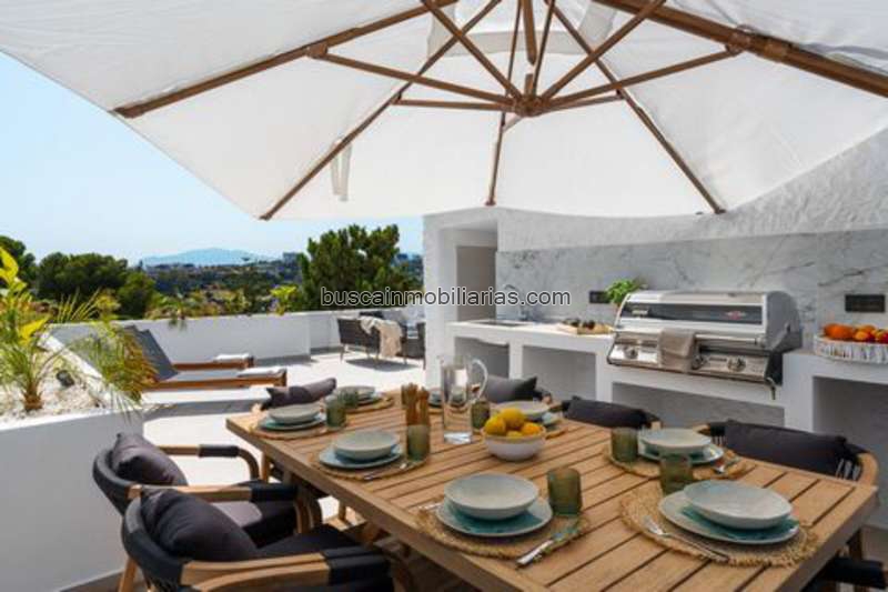 This elegant duplex penthouse redefines modern Mediterranean living in one of Nueva Andalucía’s most sought-after residential areas. Spanning two expansive floors and offering a seamless blend of indoor and outdoor spaces, it features three spacious bedrooms and two contemporary bathrooms within a built area of 172 square meters. Designed with a Scandinavian-inspired aesthetic, the interiors are calm, functional, and finished with premium materials, including a high-spec kitchen equipped with Siemens appliances.