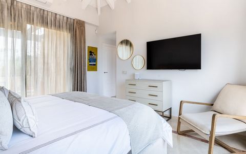 On entering, you are met by gorgeously renovated open-plan living space which has been designed to show elegance and modern charm combined. The sleek kitchen flows into an airy dining and living area, all drenched in natural light. Slide open the doors to your south-facing terrace, and you're treated to views over the tropical gardens and pools that'll make your morning coffee feel like a vacation, and a great way to have that glass of wine at the end of the day.