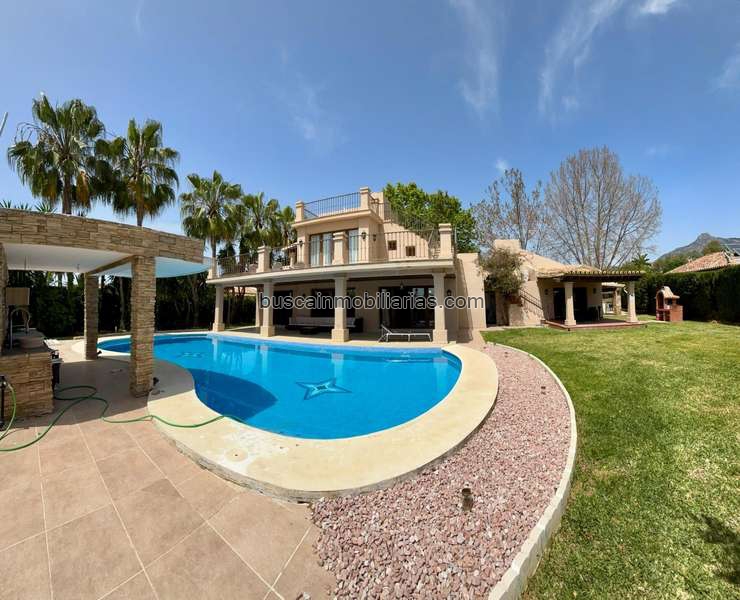 En la planta superior se encuentra el tercer dormitorio con baño en suite y acceso a un espectacular solárium con vistas panorámicas al mar y la montaña, perfecto para tomar el sol, relajarse o recibir invitados. El jardín, exquisitamente ajardinado, dispone de piscina con cascada, una pérgola cubierta y zona de barbacoa, creando un verdadero oasis privado ideal para la vida al aire libre.