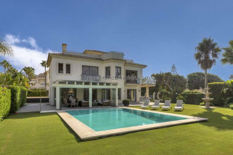 Inmaculada villa de cinco dormitorios, orientada al sur frente a la playa ubicada en El Rosario, Marbella Este. Esta villa de lujo ofrece impresionantes vistas al mar y acceso directo a la playa. La propiedad está situada en una generosa parcela plana de 1,016.23m2 que ha sido bellamente ajardinada con una piscina privada climatizada y una cubierta automática. La propiedad se distribuye en tres niveles más solárium. El nivel inferior da acceso a un apartamento independiente y al garaje. El nivel de entrada tiene una impresionante sala de estar y comedor de planta abierta; cocina totalmente equipada con electrodomésticos modernos; área de lavandería; una suite para invitados; y un aseo. Desde este nivel tiene acceso a la terraza y jardín, con parte de la terraza cerrada con cortinas de vidrio, lo que lo convierte en el espacio perfecto para vivir al aire libre en los meses más fríos. El primer piso conduce a dos suites de invitados; y la suite principal con hermosas vistas al mar. El nivel superior da acceso al amplio solárium; una zona tranquila donde podrá relajarse y escuchar el sonido de las olas o entretener a los huéspedes. Otras características incluyen un ascensor que conecta todos los niveles, armarios empotrados, garaje doble, calefacción por suelo radiante en los baños, aire acondicionado frío y caliente, paneles solares, sistema demótico, sistema de alarma y cámaras de seguridad. Con su excelente ubicación frente al mar, esta villa es una casa de ensueño cerca de escuelas y servicios; perfecta para vivir durante todo el año o como inversión para alquileres.