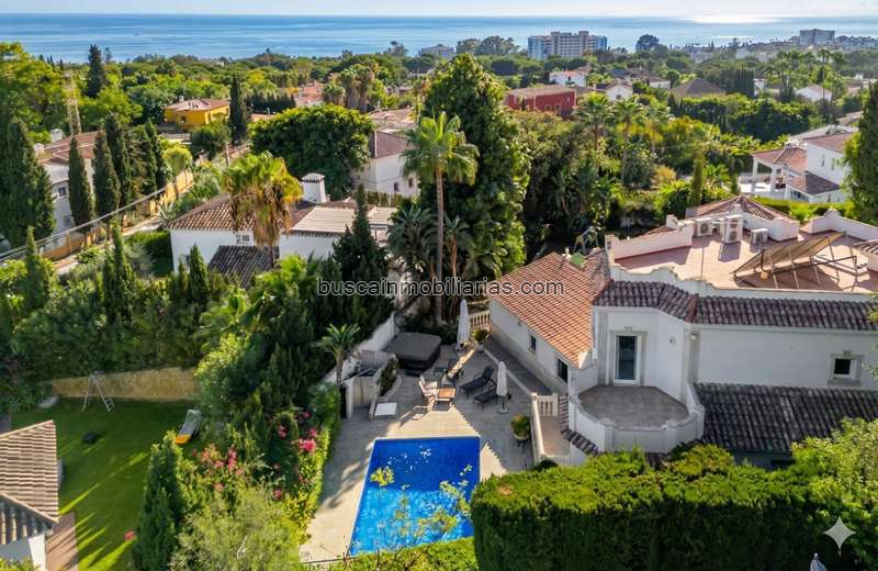 La vivienda ofrece 5 dormitorios y 4 baños sobre una parcela de aprox. 1.300 m2 con jardín maduro, piscina, varias terrazas y vistas parciales al mar (desde 1ª planta).
