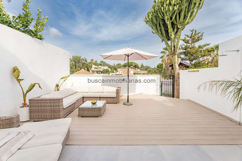 Marbella Este, centro de Elviria. Se vende fantástica y encantadora casa adosada renovada en Pueblo Sueco. Esta casa adosada se reformó completamente en 2018 y está decorada con mucho gusto en todas sus estancias. La propiedad tiene un aire moderno de alta calidad y está construida en dos plantas. Al entrar en la parcela, encontramos un acogedor patio oeste parcialmente cubierto. Está amueblado con tumbonas chillout y hay mucho espacio para comer al aire libre. Hay espectaculares cactus maduros y jardineras de fácil mantenimiento. Al entrar en la casa encontrará un práctico aseo para invitados a la derecha y la cocina totalmente equipada con todos los electrodomésticos necesarios. También en la cocina hay una acogedora ventana que da al patio delantero. El salón tiene grandes puertas plegables que dan a la terraza. En el salón hay una zona de TV con dos sofás de 3 plazas y otra zona con una bonita mesa redonda de comedor junto a la chimenea. Desde el salón se accede a una preciosa y espaciosa terraza cubierta con vistas a la piscina del club y a la zona residencial, con una mesa de 6 plazas perfecta para disfrutar del desayuno. Las escaleras nos llevan a la planta baja, donde encontramos un dormitorio de buen tamaño con otro dormitorio auxiliar que podría utilizarse como vestidor. Otro dormitorio con mucho espacio extra, con un escritorio y vestidor. Hay dos baños con amplias duchas (uno en suite) y un lavadero/trastero. Estas dos habitaciones dan acceso al patio de la planta baja, desde el que se puede acceder directamente al club de piscina privado. En el patio podrá encontrar una plataforma donde se puede relajar en las tumbonas y usar la ducha solar. Opcionalmente, se puede ser socio del club pagando una cuota anual. Hay aire acondicionado frio/calor marca Daikin, suelo radiante en los baños y fibra óptica de alta velocidad. Los vecinos son una mezcla de nacionalidades locales e internacionales. A 10 minutos andando llegamos a la mejor playa de Marbella y a 10 minutos en coche a la ciudad de Marbella. El aeropuerto de Málaga a menos de 45 minutos. También hay varios campos de golf de 18 hoyos, como Santa María Golf, Santa Clara, Río Real y Marbella Golf. Marbella se ha convertido en una marca en Europa y en todo el mundo, con 320 días de sol al año y un total de 2900 horas de sol. Elviria representa la esencia misma de la calidad de vida en la Costa del Sol. Está situada en un entorno natural único y cuenta con una fantástica oferta de servicios en las inmediaciones, entre los que se incluyen tres hoteles de cuatro y cinco estrellas: Don Carlos, Marriott y Estrella del Mar, campos de golf de renombre como Santa María y Green Hills, un restaurante con estrella Michelin, el club de playa Nikki Beach y una de las mejores playas de la costa, todo ello flanqueado por excelentes bares y restaurantes, supermercados y un mercadillo local todos los viernes y uno ecológico cada dos sábados. Además, hay Tenencia de Alcaldía, una consulta médica, una oficina de correos, una amplia oferta de colegios, incluidos colegios privados...todo ello a poca distancia. Se trata de una oportunidad única y la ubicación ideal tanto para una residencia permanente como para la casa de vacaciones de sus sueños.