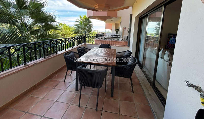 La terraza principal, conectada al salón y a la suite principal, funciona como un auténtico salón al aire libre: zona chill out con sofás, gran mesa comedor y vistas abiertas al mar y al campo de golf, junto al conocido Río Real Golf Club.