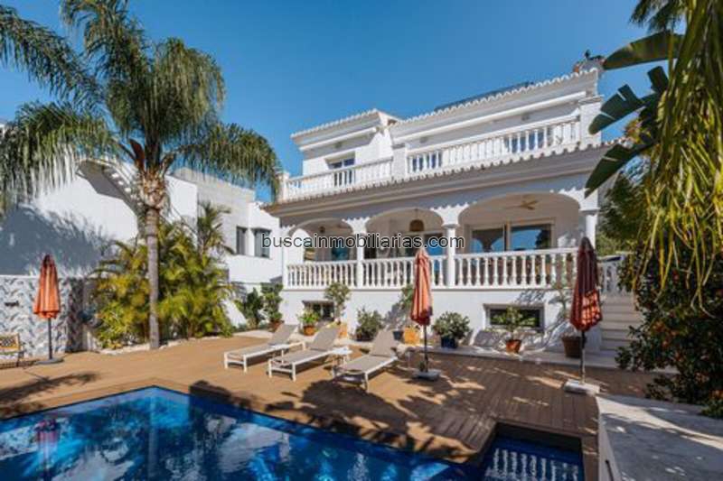 This lovely 4-bedroom villa is offered for sale in a quiet and private environment of Nagüeles, a prestigious and classy area on the Golden Mile of Marbella. A slightly elevated position above the glamorous coastal strip of the Golden Mile gives the high-end properties of Nagüeles magnificent views of the Mediterranean Sea and iconic La Concha Mountain. Adjacent to 2 of Marbella’s most exclusive areas, Cascada de Camojan and Sierra Blanca, Nagüeles was one of the first high-end urbanisations in Marbella. It has retained its original cache and sense of style. Living here is living in exquisite luxury.The location is very peaceful and convenient, close to everything you need for the most comfortable life. Finding a more beautiful beach than Playa Nagüeles is probably impossible. Boasting the Blue Flag, it is lined by some of the most exclusive restaurants, beach clubs and hotels on the Costa del Sol. You will live minutes away from superb golf courses, glamorousPuerto Banús and of course, all amenities of Marbella Golden Mile. It is also the perfect area for families, since it is very close to several excellent international schools. The journey time to Malaga and Gibraltar airports is less than an hour.Surrounded by beautiful vegetation and similar luxury properties of Marbella Golden Mile, the 344m2 house full of southern charm, sits on 538m2. It is in full harmony with its lush green environment and offers idyllic nature views and a beautiful concept of stress-free, luxurious Mediterranean life. The exquisite white villa's design has attractive features including lovely terraces, a subtropical garden and a swimming pool, which transform the home into a real Mediterranean sanctuary for year-round enjoyment. Built to the high standards, the high-end property offers luminous and airy living and dining spaces, fully fitted kitchen, 4 serene bedrooms and 3 bathrooms, etc. The interior seamlessly connects to the stunning terraces, fostering a harmonious indoor-outdoor flow. Thanks to the glass doors the villa is bathed in natural light. The outdoor areas are ideal for chilling out, having dinners al fresco and BBQ with friend and family. Surrounded with a landscaped garden, the pool area invites to swim, sunbathe and soak up the sun, enjoying the climate that is considered the best in continental Europe. With its super attractive location and classic luxury, this residence is ideal for the famous Marbella lifestyle.