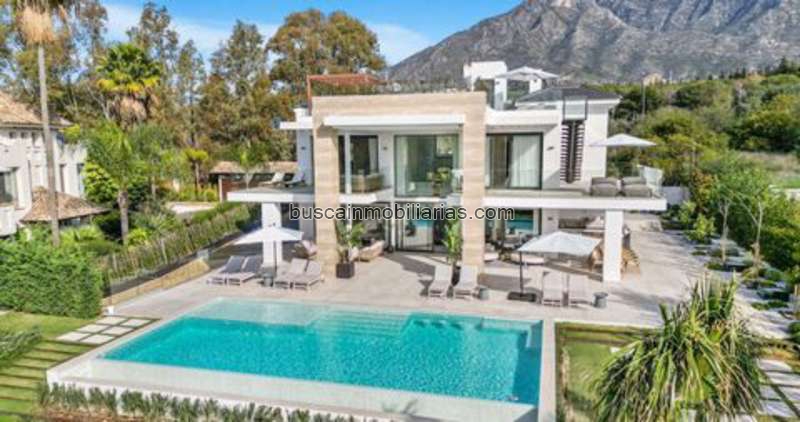 Brand new six bedroom, south facing villa in Lomas del Marques, an exclusive gated community just above the Puente Romano on Marbella’s Golden Mile; within easy walking distance to the beach and within east reach of both Puerto Banus and Marbella Town. . This impressive property boasts an immaculate landscaped private garden complete with heated swimming pool; an open plan living and dining room with direct access to the garden; top of the range open plan kitchen; and a guest suite. The first floor has two guest suites; the luxury master suite with walk in wardrobe and a private terrace; also from this level there is access to a large solarium with spectacular sea views, and complete with jacuzzi & outdoor kitchen. The lower level of the property has an entertainment room with pool table, lounge and bar; two guest suites; and access to the garage. Other features include private garage for three cars and electric car chargers, hot and cold air-conditioning, built-in wardrobes, alarm system, security cameras and an elevator connecting all levels. An incredible property perfect for year-round living or as a rental investment with touristic license already in place.