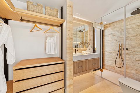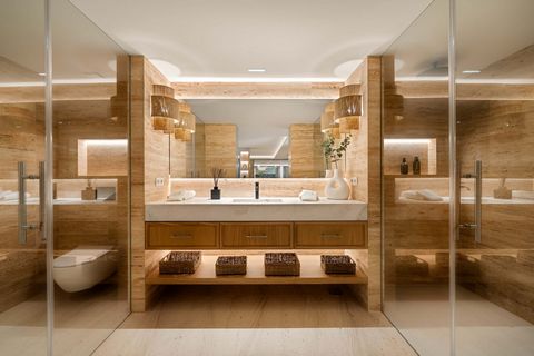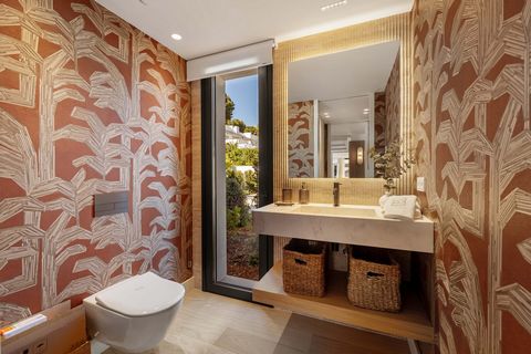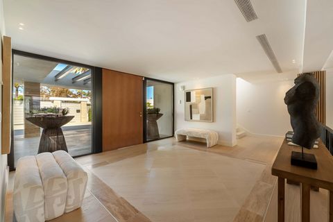 This enchanting villa is located in the prestigious Aloha area of Nueva Andalucía, offering a perfect blend of modern elegance and natural charm. With a striking architectural design that harmonizes clean contemporary lines with traditional elements, the property stands out for its unique character and refined presence. The symmetrical façade, expansive windows, and lush green entrance create an inviting and sophisticated ambiance, while classic roof tiles pay homage to the region’s cultural heritage. Crafted with meticulous attention to detail, the villa was designed by the renowned GC Studio, with top-quality construction executed by B. Solis. The beautifully landscaped gardens, curated by Juan Pedro Sacedón Paisajismo, further enhance the serene atmosphere. Cutting-edge home systems installed by Techno Clima ensure a high level of comfort, efficiency, and modern convenience throughout the property. Inside, the interiors are styled in calming neutral tones and natural materials that evoke warmth and understated luxury. Wooden accents, such as ribbed wall partitions, add texture and depth, seamlessly connecting the open-plan living and dining areas with the kitchen. The home offers five spacious and elegantly appointed bedrooms, designed for both privacy and comfort. Positioned to enjoy panoramic views of the nearby golf course—a signature feature of the Aloha area—this villa is an exceptional offering for those seeking a sophisticated and tranquil lifestyle in one of Marbella’s most sought-after neighborhoods.