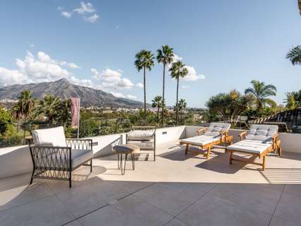 Es una villa de lujo recientemente renovada, situada en el exclusivo barrio de Las Brisas Golf en Nueva Andalucía, Marbella. Con una superficie de 802 m², esta propiedad de cinco dormitorios y cinco baños es el epítome de la vida contemporánea, ofreciendo tanto privacidad como acceso cercano a las mejores comodidades de la zona. La villa cuenta con garaje cubierto para dos coches, trastero, lavadero, y vistas impresionantes a la montaña de La Concha y al campo de golf. Además, la propiedad está equipada con paneles solares para garantizar la eficiencia energética y mantener bajas las facturas de electricidad.EXTERIORESEl exterior de la villa destaca por su jardín privado meticulosamente cuidado, que rodea una piscina climatizada y una zona chill-out perfecta para relajarse y disfrutar del clima mediterráneo. La villa también dispone de amplias terrazas, tanto en la planta superior como en la azotea, que ofrecen vistas panorámicas de 360 grados del campo de golf Las Brisas y las montañas circundantes. En la azotea se encuentra un jacuzzi y una zona de barbacoa, ideales para disfrutar de momentos de ocio al aire libre.INTERIORESEl interior de la villa está diseñado con materiales de alta gama, como suelos de mármol y una distribución abierta que favorece la luminosidad natural. En la planta baja se encuentran tres de los dormitorios en suite, una moderna cocina abierta de un fabricante alemán, un comedor totalmente amueblado, y una sala de estar con chimenea que conecta directamente con el jardín y la piscina. También dispone de un aseo de invitados y una sauna privada. En la planta superior se encuentran dos dormitorios más, incluido el dormitorio principal, que tiene acceso a una terraza con vistas espectaculares. Todos los dormitorios cuentan con baños en suite y calefacción por suelo radiante para garantizar el confort durante todo el año.
