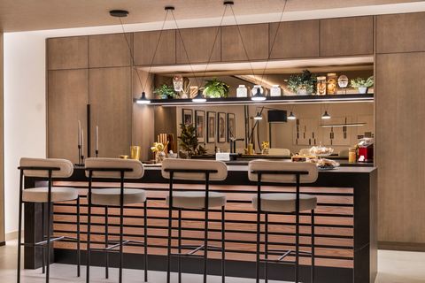 The lower level of the villa boasts an entertainment room with a pool table, lounge, and bar area, along with two more guest suites and access to the garage.