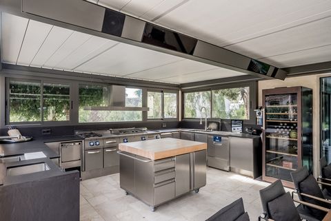 Outdoors, you’ll find an impressive professional-grade restaurant kitchen, perfect for entertaining, along with multiple cozy chill-out areas surrounding the heated pool and jacuzzi. A fully equipped gym ensures wellness is always within reach.
