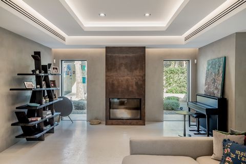 The heart of the home is its large, open-plan living and dining area, featuring a state-of-the-art kitchen with top-of-the-line appliances, wine fridges, and a striking central dining table for 10. A beautiful fireplace adds warmth and charm to the space.