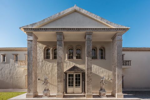 Spanning 2,009 square meters and set on a 4,131-square-meter plot, the property is surrounded by beautifully landscaped gardens, featuring Italian cypress and mature olive trees that enhance the Mediterranean charm of the space. Inside, the home features luxurious travertine floors and unique fabric-clad walls, replacing traditional wallpaper. Gold-plated door handles and rich red wood doors add to the estate’s elegance, while soundproofed walls ensure privacy and peace throughout. There are seven spacious bedrooms, each with its own en-suite bathroom and private terrace. The layout, with three bedrooms upstairs and three downstairs, creates a balanced, functional design. A private office, complete with a built-in safe, adds extra convenience.