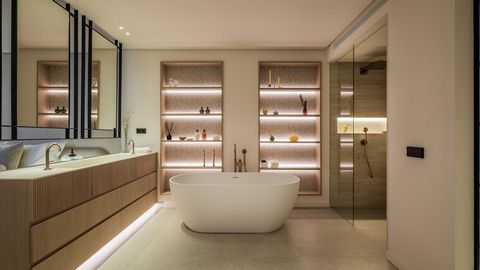 Esta extraordinaria villa cuenta con cuatro habitaciones en el nivel principal, cada una elegantemente equipada con instalaciones en suite y terrazas privadas. La habitación principal, que abarca casi 40 metros cuadrados, presenta un lujoso refugio con vestidor y un baño de diseño integrado en un diseño de planta abierta, elevando la sensación de lujo y sofisticación.