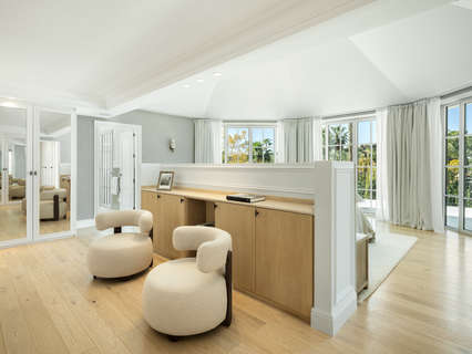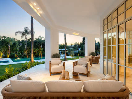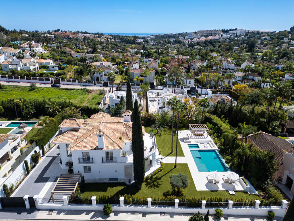 En el corazón de Nueva Andalucía se alza una impresionante villa de lujo de cinco dormitorios que combina a la perfección elegancia, confort y una ubicación privilegiada. Con una amplia parcela de 1.959 m² y una generosa superficie construida de 722 m², esta propiedad refleja la esencia de la sofisticada vida mediterránea. Su impactante fachada blanca, jardines impecablemente cuidados y majestuoso camino de entrada anticipan la calidad y el diseño excepcionales presentes en cada rincón.EXTERIORESLa zona exterior ofrece un auténtico paraíso para el ocio y la relajación, con una espectacular piscina, un salón con hoguera en desnivel y amplias terrazas perfectas para comidas al aire libre. El paisaje, embellecido con cipreses maduros y vegetación vibrante, garantiza privacidad y serenidad. La posición elevada de la villa permite disfrutar de vistas privilegiadas al valle del golf y de un entorno exclusivo a pocos minutos de campos de golf de renombre, colegios internacionales, restaurantes de lujo y Puerto Banús.INTERIORESLos interiores destacan por su luminosidad y amplitud, con espacios diáfanos, techos altos y una paleta de tonos neutros que aportan elegancia y calidez. La propiedad cuenta con múltiples salones, una cocina a medida, un cine en casa de última generación, bodega, gimnasio y spa totalmente equipados. Cada uno de los cinco dormitorios es un refugio privado con baño en suite y acceso directo a terrazas o zonas ajardinadas. La fluida conexión entre los espacios interiores y exteriores convierte esta villa en un lugar perfecto para disfrutar del estilo de vida marbellí durante todo el año.