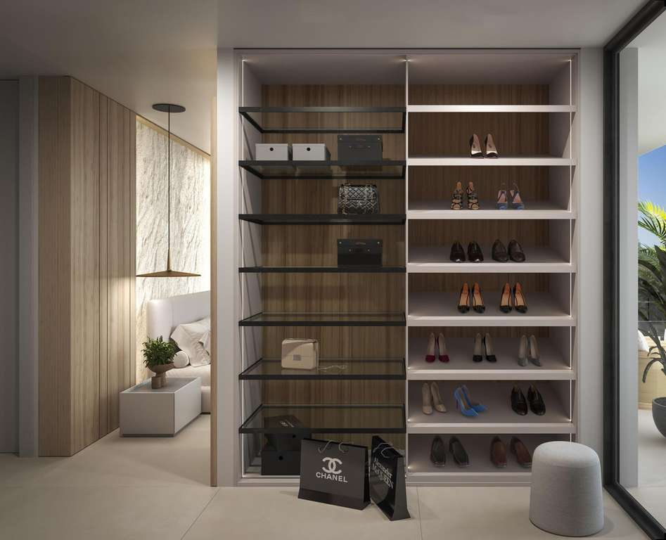 - En dormitorio principal, vestidor con iluminación LED y distribución funcional con cajoneras y estantes de cristal.