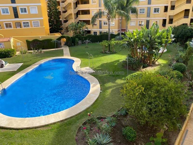 La vivienda se distribuye en dos dormitorios, salón-comedor, cocina independiente y dos baños. Cuenta con cocina amueblada y equipada con muebles altos y bajos, vitrocerámica, horno y campana extractora. Además, cuenta con ascensor, terraza, estacionamiento, piscina y almacenamiento.