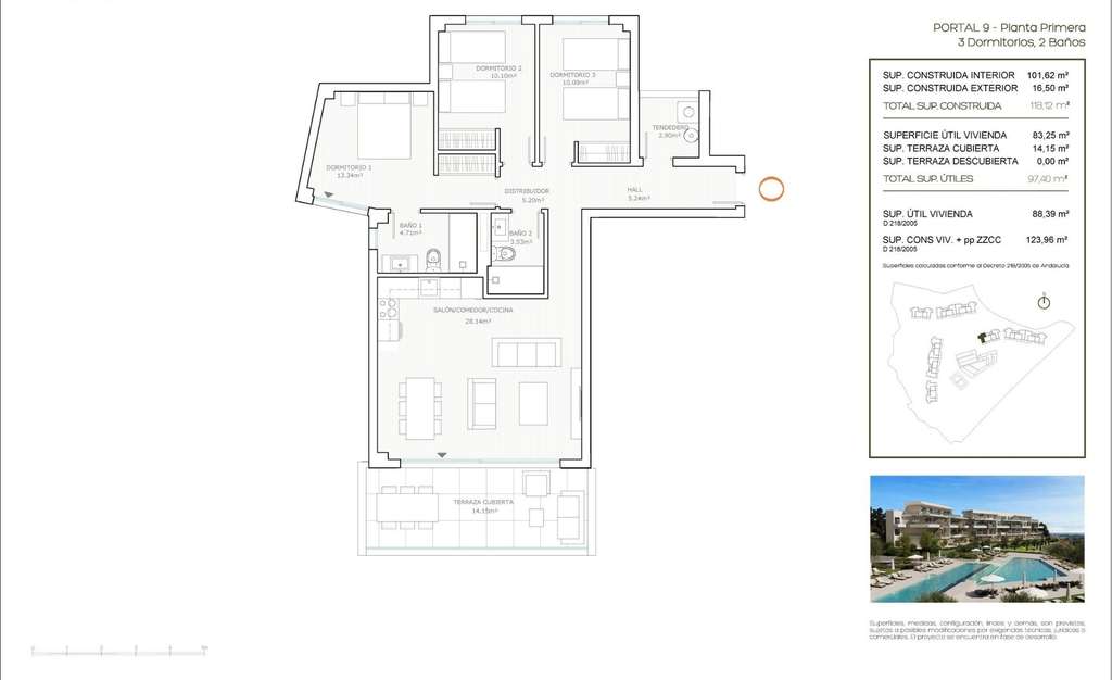Este nuevo proyecto residencial en Mijas, Málaga, ofrece 120 elegantes apartamentos de 1, 2 o 3 dormitorios, cuidadosamente diseñados para proporcionar el máximo confort y un estilo de vida moderno. Construida en una amplia parcela de 31 000 m², la comunidad está rodeada de jardines paisajísticos, lo que crea un entorno tranquilo y verde. Su elevada ubicación en una ladera garantiza unas espectaculares vistas de 180 grados al mar, lo que la convierte en un lugar ideal para disfrutar del clima mediterráneo durante todo el año.