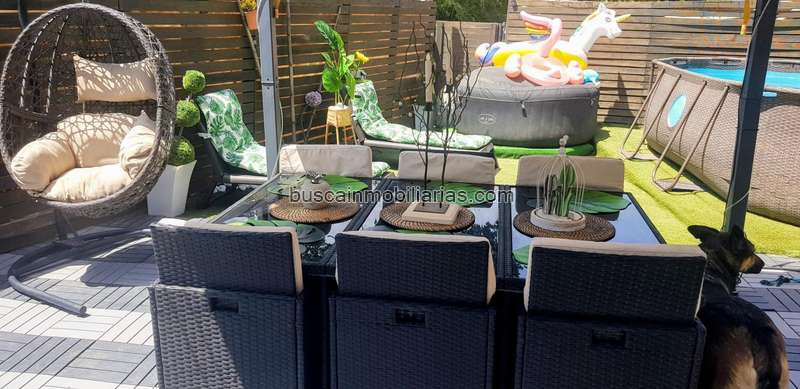 En la planta baja encontramos tres dormitorios, un baño muy grande, y una salida a un patio propio que se ha utilizado de gimnasio, otra salida al jardín privado, un jardín grande, donde hacer barbacoas, reuniones y disfrutar del sol y de las noches de verano.