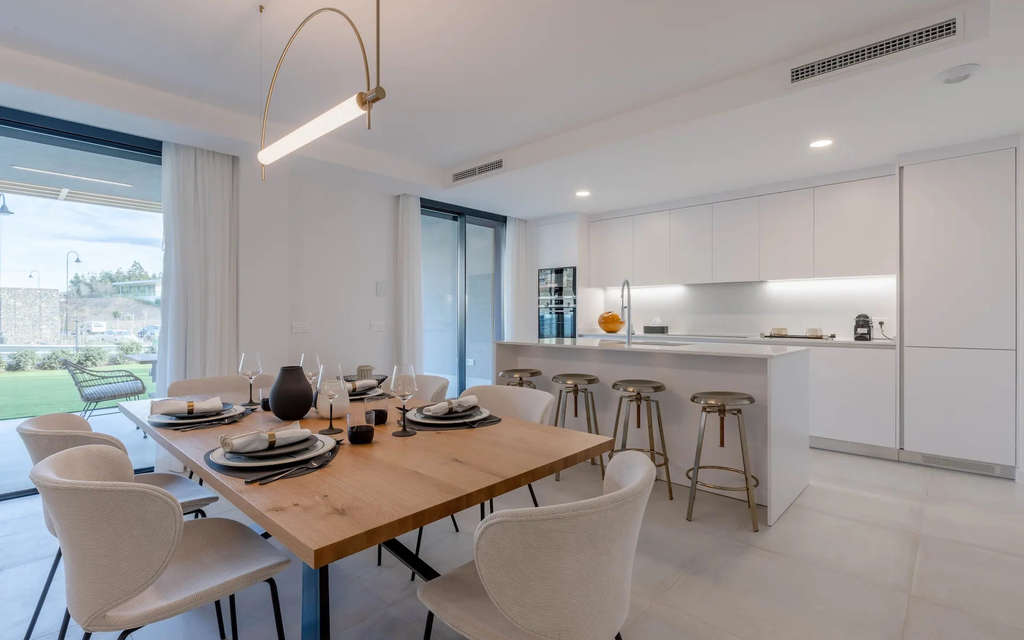 Los exteriores del complejo residencial destacan por su diseño moderno, con amplias terrazas que ofrecen vistas inigualables al mar y al campo de golf. Las zonas comunes están cuidadosamente diseñadas para proporcionar un entorno relajante y exclusivo, con extensos jardines y una piscina comunitaria que invita a disfrutar del clima mediterráneo. Además, el acceso al exclusivo centro deportivo y de ocio adyacente ofrece instalaciones de primer nivel, como pistas de pádel, SPA y gimnasio, que complementan perfectamente el estilo de vida activo y saludable que se promueve en este residencial.