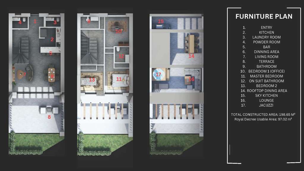 La promoción ofrece una selección de casas adosadas y unidades en esquina cuidadosamente diseñadas para maximizar la luz, el espacio y la privacidad. Cada vivienda se distribuye en dos plantas principales más un solárium privado en la azotea. En la planta baja se encuentra una sala de estar y comedor de planta abierta con cocina integrada, lavadero, aseo de invitados y acceso directo a la terraza y al jardín privado. La planta superior cuenta con tres dormitorios dobles y dos baños, incluido un dormitorio principal con baño en suite.