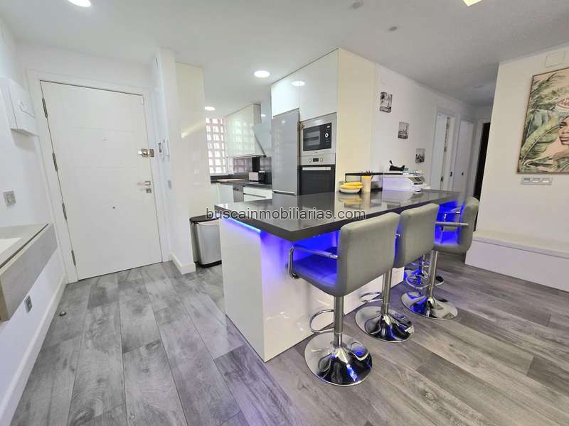 La propiedad consta de 3 dormitorios dobles, 2 cuartos de baños completos (1 en suite), preciosa y moderna cocina abierta al salón con una península con leds para desayunos y compartir conversaciones mientras se cocina, y amplio salón comedor con salida a una agradable terracita. Además una de las cosas más importante que tiene es una espaciosa plaza de garaje en el edificio. El edificio no dispone de ascensor, pero es una segunda planta con tramos cortos de escalera, y está previsto por la comunidad poner ascensores en poco tiempo.
