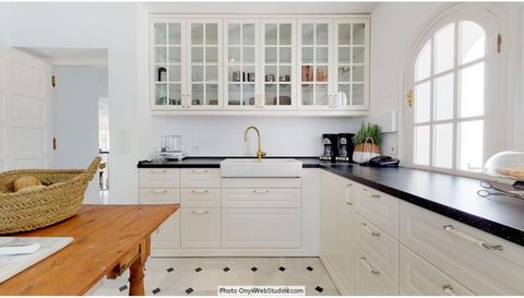 The Plot is 6092 m2 with mature garden. Impressive entrance driveway from street is leading to the villa. Villa at approx. 1.135 m2 with entrance hall leading to a large lounge with high ceilings and a fireplace, dining area and 3 doors out to the partly covered terrace with beautiful sea views and an infinity pool with heating.