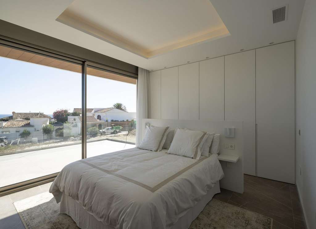 Planta superior: dormitorios adicionales, incluida la suite principal con bañera independiente y acceso a terrazas privadas, algunas con vistas al mar.