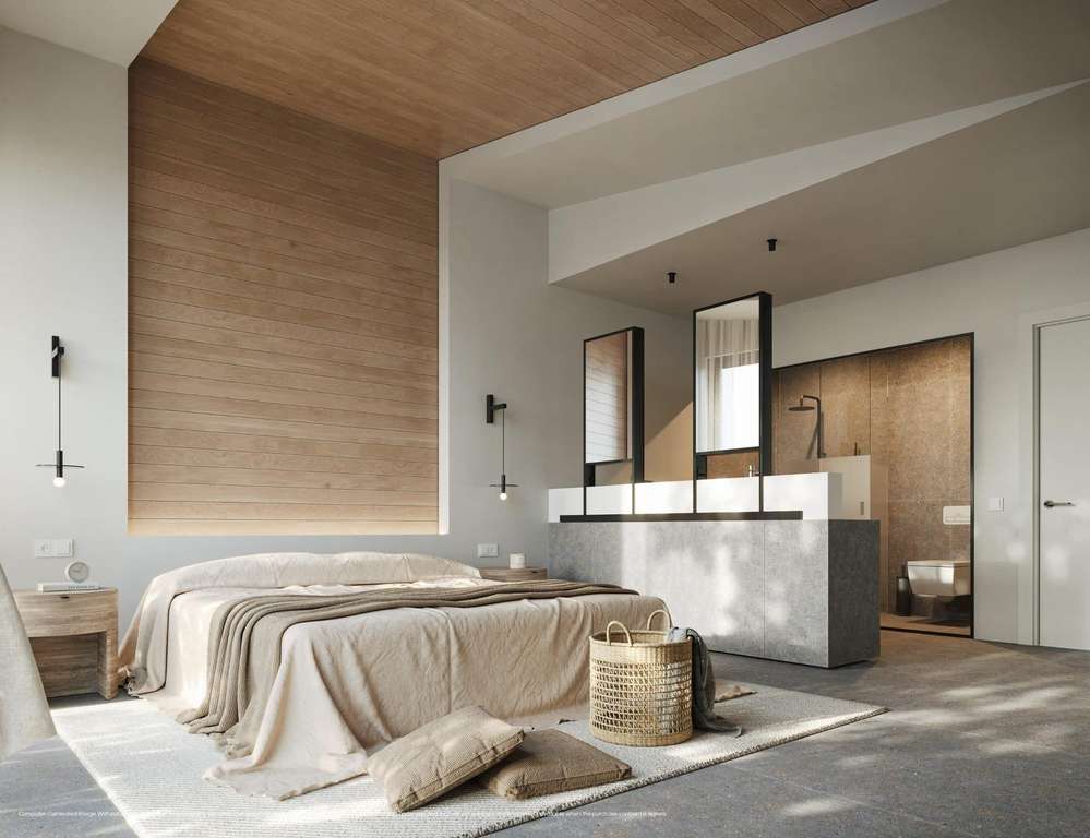 Materiales como la madera natural se han utilizado en zonas seleccionadas del revestimiento de la villa, permitiendo un diálogo constante con el paisaje natural que la rodea, y otorgando indiscutiblemente al proyecto la singularidad, elegancia y pureza que define a las villas de Obra Nueva.