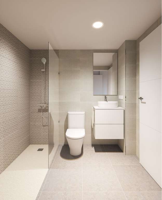 INTERIORES Los interiores de las viviendas han sido diseñados con un enfoque en la funcionalidad y el confort, ofreciendo una distribución excelente que maximiza el espacio y la luminosidad. Las cocinas están amuebladas con encimeras de piedra natural, y todos los dormitorios cuentan con armarios empotrados, proporcionando un ambiente organizado y elegante. La instalación de aire acondicionado por conductos en el salón-comedor y en los dormitorios garantiza un clima agradable durante todo el año. Los baños están equipados con duchas o bañeras, según la preferencia, asegurando que cada detalle esté pensado para el bienestar de los residentes.