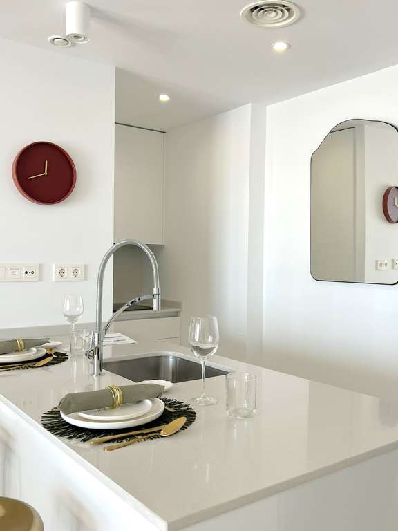 Complejo residencial frente al mar. Pisos y áticos con amplios y luminosos espacios y espectaculares terrazas de más de 20m² en la mayoría de las propiedades, que, con sus barandillas de cristal, ofrecen vistas maravillosas. Cada propiedad cuenta con espacios interiores perfectamente distribuidos para integrarse con el entorno en el que se encuentra.
