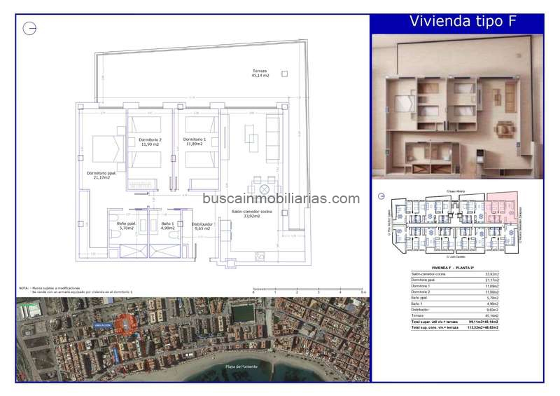 Mantiene la misma distribución cómoda y funcional: tres dormitorios dobles, con dormitorio principal en suite y vestidor, segundo baño completo y salón-comedor con cocina integrada.