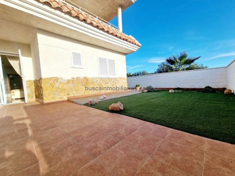Desde este jardín —el verdadero corazón de la vivienda— accedes directamente al interior. Salón, dormitorios y cocina se abren al exterior, creando una conexión constante con el verde, el aire y la tranquilidad. La puerta principal nos lleva directamente a un comedor amplio y luminoso, con sensación de espacio desde el primer paso. A la derecha, un pequeño vestíbulo distribuye dos dormitorios exteriores, ambos con armarios empotrados, y un baño con ducha y ventana, práctico y funcional. Avanzando, encontramos un tercer dormitorio amplio, perfecto como dormitorio principal o incluso como despacho si trabajas desde casa. Frente a él, un segundo baño completo con bañera, ideal para el día a día o para invitados. Al fondo, la cocina: amplia, cómoda, con espacio para comer, totalmente amueblada y equipada, y con salida directa a la galería-lavadero y a la calle, un plus de funcionalidad que marca la diferencia. Cuenta con calentador eléctrico, lavadora-secadora y zona independiente de lavado. La vivienda es planta baja, totalmente exterior, en esquina, accesible y con una orientación sureste ideal, lo que se traduce en luz natural, frescor y ventilación cruzada durante todo el año. Forma parte de una urbanización con piscina comunitaria, perfecta tanto para vivir todo el año como para disfrutarla en vacaciones.