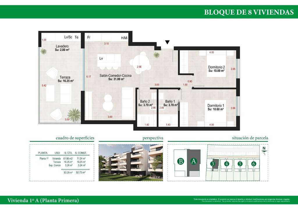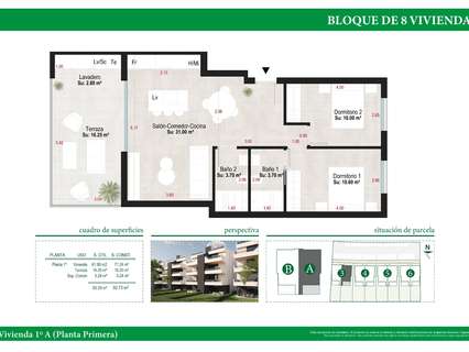 Los apartamentos tienen una superficie entre 73.88m2 y 75.22m2 repartidos en 2 dormitorios, 2 baños, un salón-cocina-comedor abierto de 26.80m2, 17m2 de terraza.